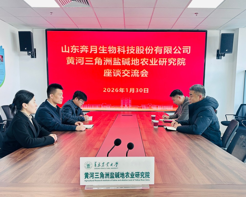 1月30日,山东奔月生物科技股份有限公司董事长陈良一行到访青岛农业大学黄河三角洲盐碱地农业研究院,双方围绕合成生物学与盐碱地农业的交叉创新、科技成果转化与产教融合举行座谈,共同探讨校企协同发展新路径。研究院院长丁国庆及班子成员参加座谈。